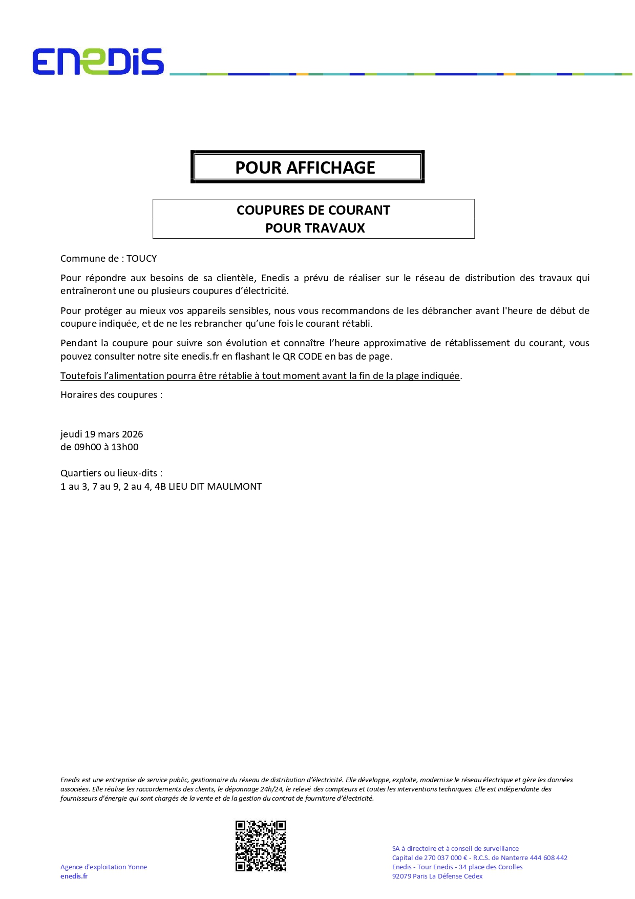Coupures de courant pour travaux jeudi 19 mars 2026