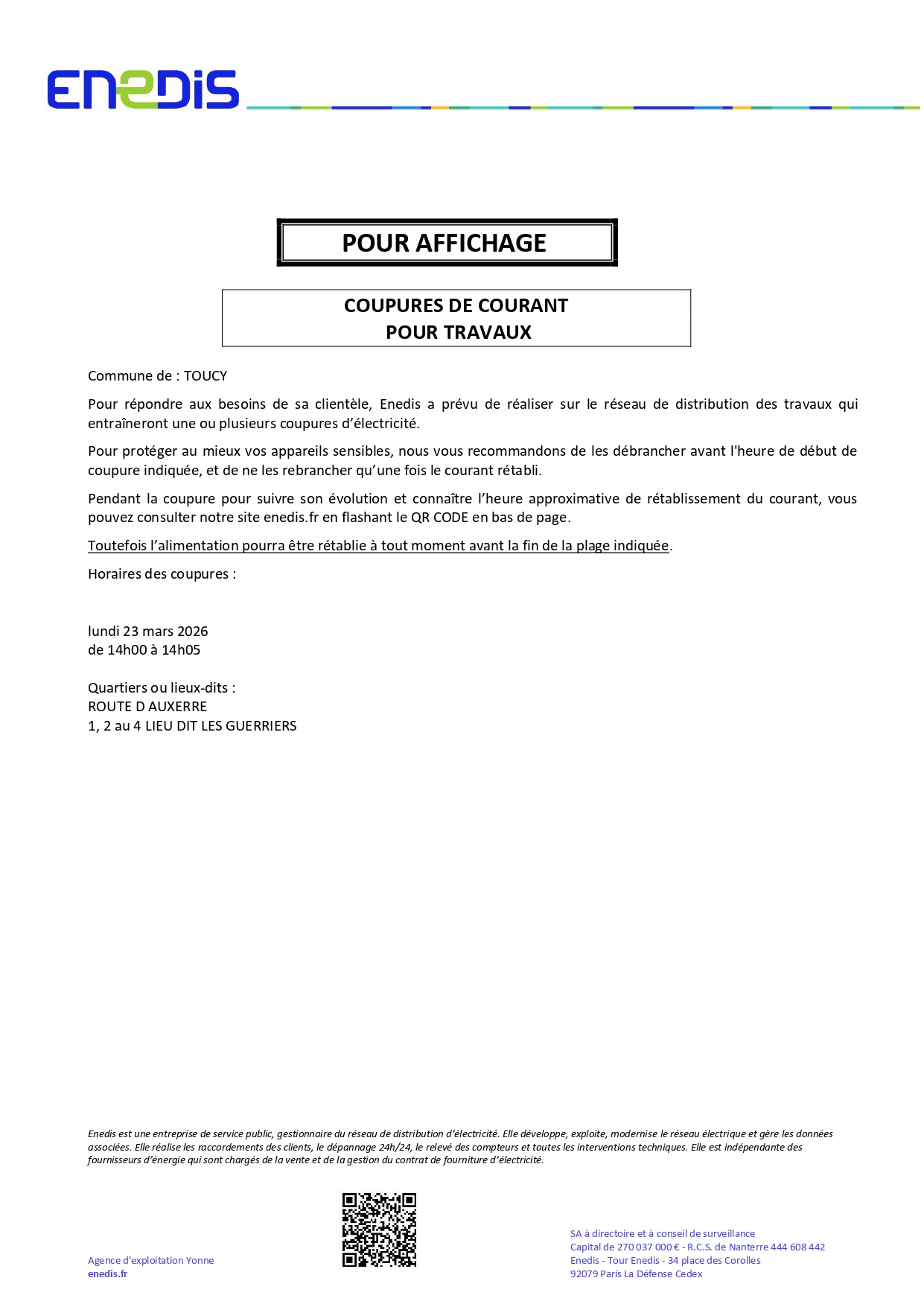 Coupres de courant pour travaux le 23 mars 2026